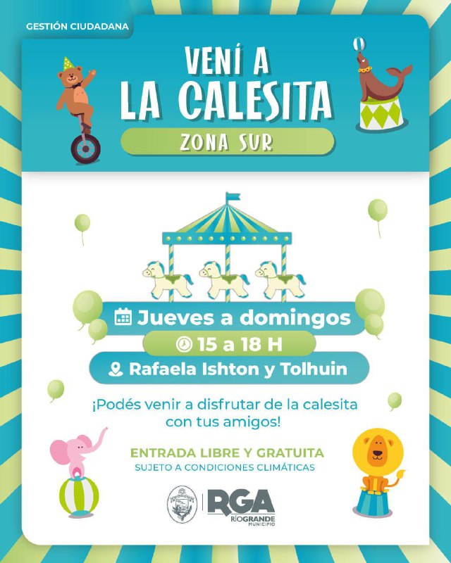 El Municipio de Río Grande invita a las vecinas y vecinos a disfrutar de la Calesita de Zona Sur, un espacio recreativo al aire libre ideal para que las familias, niños y niñas pasen momentos de alegría en un entorno seguro y divertido.